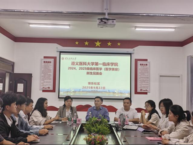 为加强新生专业认知教育,发挥高年级学生“传帮带”作用,促进不同年级学生间的交流与融合,2025年9月22日19::00,遵义医科大学附属医院烧伤整形外科联合第一临床学院在在博乐学生社区活动室举办了2024、2025级学生见面会。遵义医科大学附属医院党委委员、副院长魏在荣、第一临床学院党委副书记杨洪艳、遵医附院烧伤整形外科医生刘志远、2024、2025级临床医学(医学美容卓越班)辅导员李小兰、牟煜、谢雪艳及全体学生参加活动。