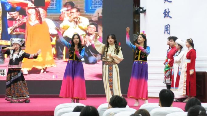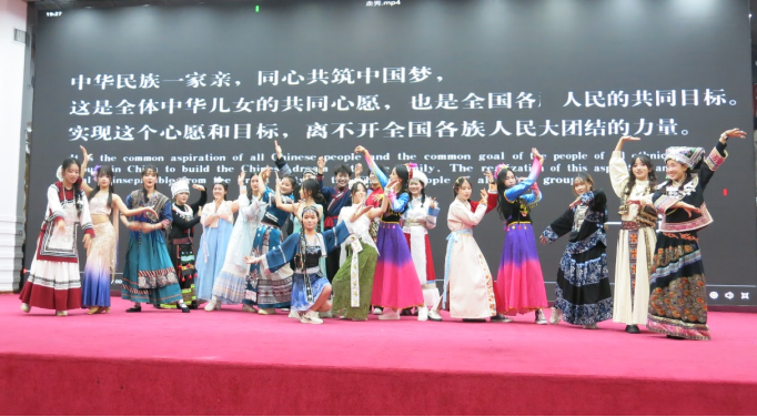 活动聚焦“心手相牵,民族团结”多彩民族服饰秀,通过“民族舞蹈展演+民族服饰走秀”的组合形式,为在场师生呈现了一场沉浸式的民族文化体验。在“民族大融合舞蹈”环节,表演者深度融合多民族舞蹈精髓,以灵动舞姿搭配特色服饰,将各民族文化的鲜活活力与独特韵味展现得淋漓尽致;随后的服饰走秀环节,参与者身着各民族传统盛装依次登台,通过规范的台步与神态展示,生动解码了民族服饰背后承载的历史底蕴与文化内涵。整场活动既兼具视觉美感与艺术感染力,让中华民族共同体意识在具象化的文化体验中落地生根、深入人心。
