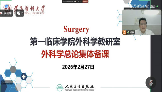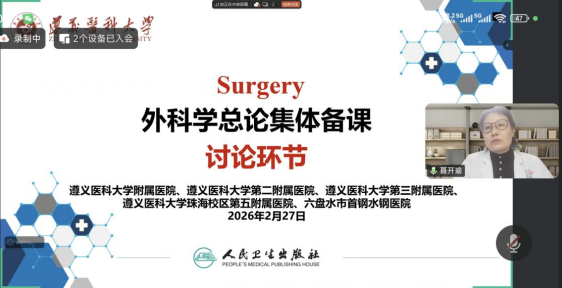 为深化校院教学协同,凝聚教学智慧,提升《外科学》教学质量,2026年2月27日晚,遵义医科大学第一临床学院外科学教研室组织开展《外科学》总论章节集体备课。本次备课创新采用“线上+线下”同步模式,遵义医科大学第二、三、五附属医院及六盘水市首钢水钢医院教学同仁齐聚云端,携手共研教学良方,外科教研室备课主持人、课程组成员、教学秘书全程参与,同频共振话教学。