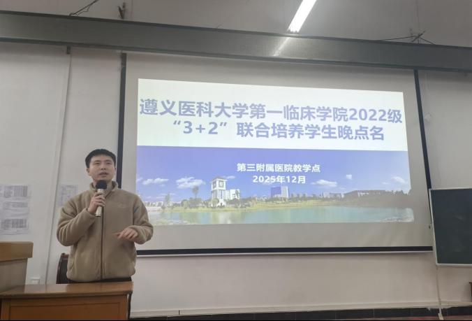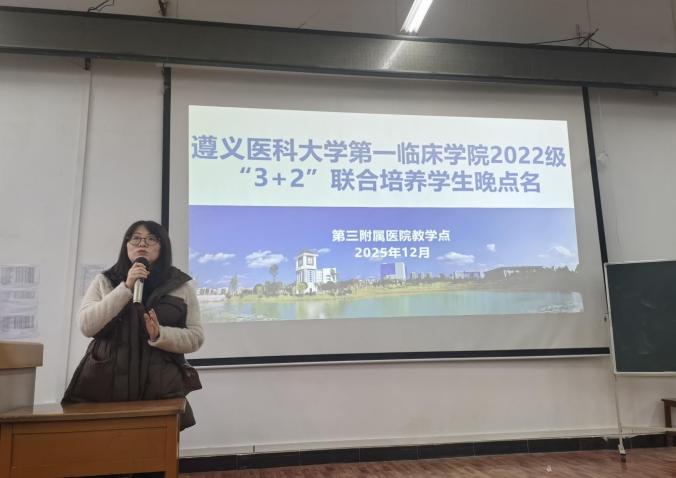 为深入落实立德树人根本任务,深化医教协同机制,精准对接“3+2”联合培养学生在院学习期间的成长需求,进一步加强教育管理与服务保障,全面了解学生的思想、学习与生活状况,2025年12月15日,遵义医科大学第一临床学院党委副书记杨洪艳带领2022级辅导员一行7人,前往遵义医科大学第三附属医院教学点,开展走访慰问与专题宣教活动。